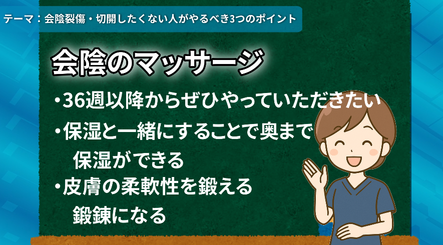 マッサージの詳しい方法やタイミングについては、引き続き後編動画でもお伝えする予定ですが、「保湿」と同じく、出産に備えて準備する大事なケアです。